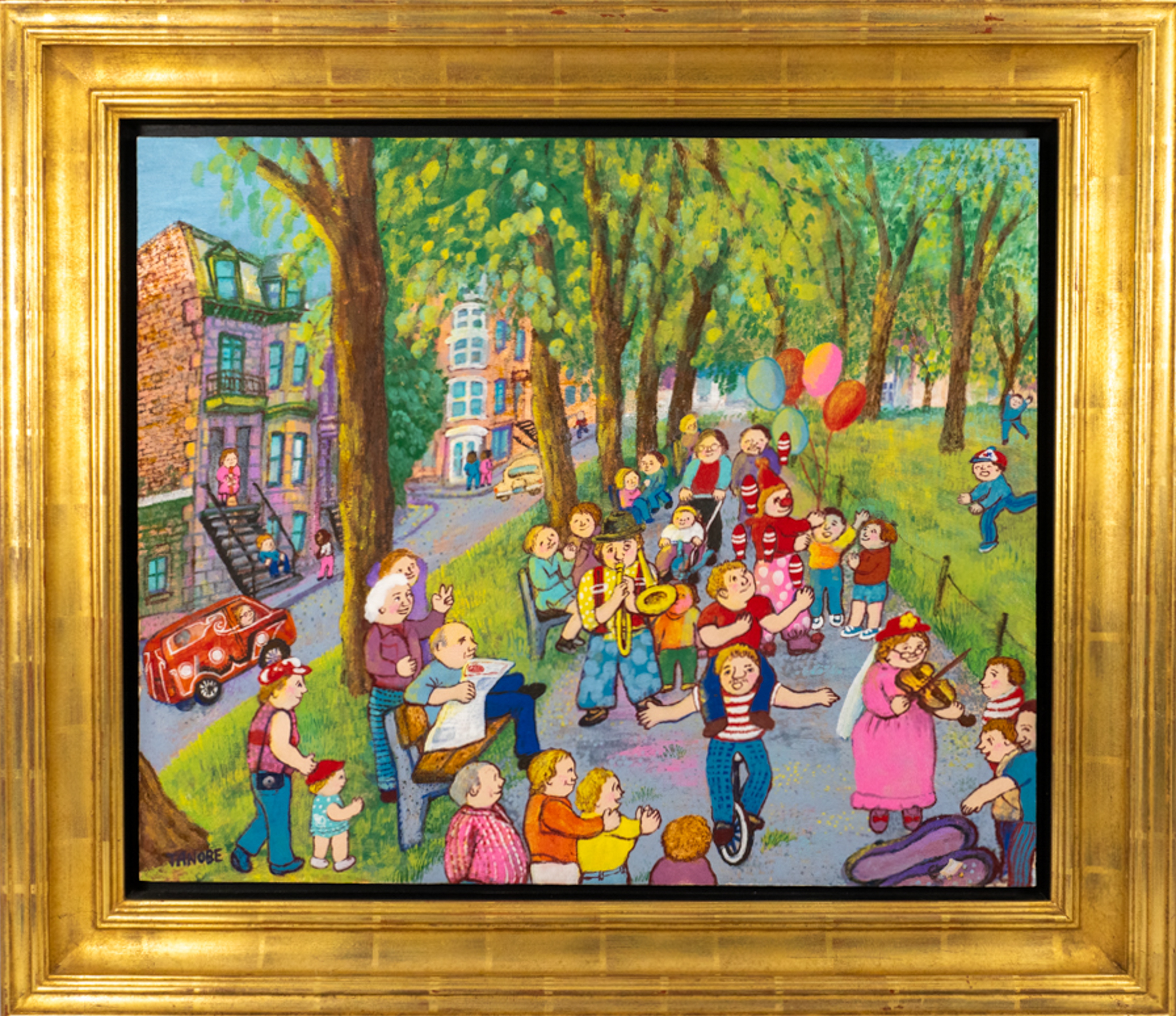 Originaire du Japon et établie à Montréal en 1971, Miyuki Tanobe a développé une esthétique que l’on qualifie souvent de réaliste-naïve, bien qu’elle soit d’une grande rigueur technique. Son style se caractérise par l’utilisation de la nihonga (peinture traditionnelle japonaise à base de pigments naturels et de colle) appliquée sur des panneaux de bois. Elle dépeint la vie urbaine et ouvrière du Québec — scènes de ruelles, parties de hockey de rue, marchés animés — avec une perspective à vol d’oiseau et une profusion de détails qui fourmillent de vie et d’anecdotes.