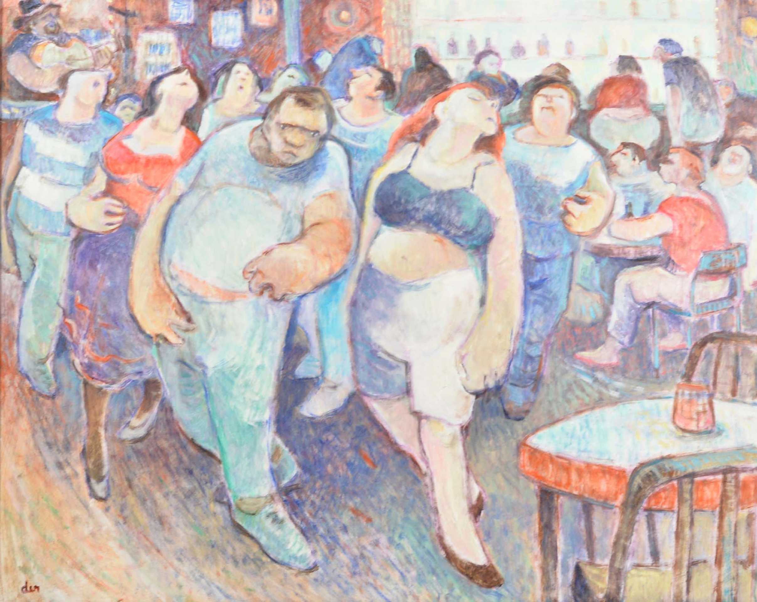 Artiste autodidacte à la signature visuelle unique, John Der a développé une esthétique de la narration spontanée. Son style se reconnaît à son trait vif, presque caricatural par moments, et à ses compositions denses qui grouillent de vie. Il privilégiait des scènes urbaines et sociales — cafés, marchés, coins de rue montréalais — rendues avec une économie de moyens et une palette de couleurs souvent sobres mais percutantes, capturant l’agitation humaine avec une efficacité graphique remarquable.