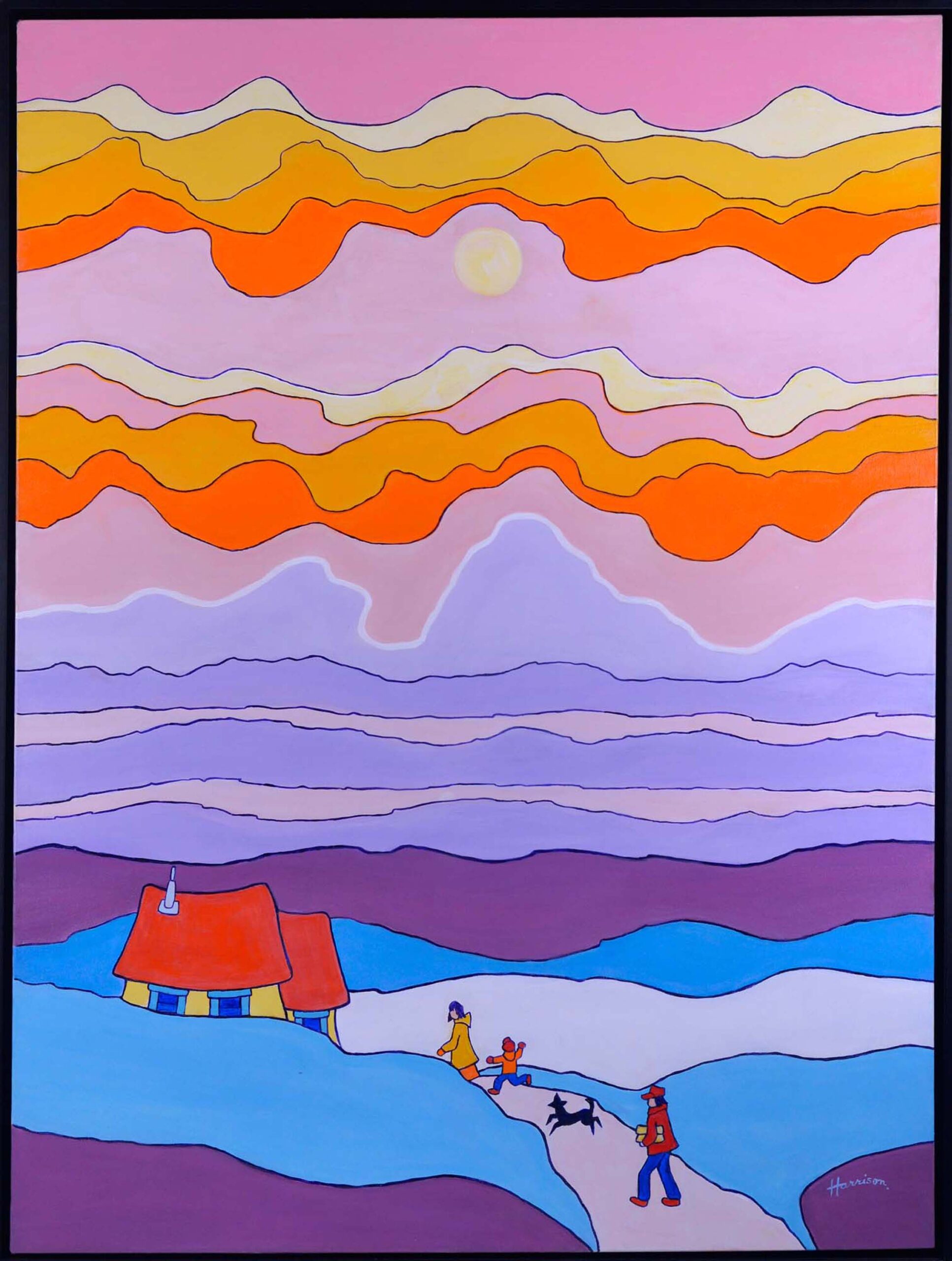 Né en Angleterre et installé au Yukon en 1967, Ted Harrison a révolutionné la représentation de l’Arctique avec une esthétique de la simplification joyeuse. Rompant avec le réalisme austère, son style se définit par des lignes sinueuses, des formes épurées et une palette de couleurs éclatantes — oranges brûlants, violets profonds et bleus électriques. Ses compositions superposent les plans sans perspective traditionnelle, créant des paysages rythmés où le ciel et la terre fusionnent dans un mouvement fluide.