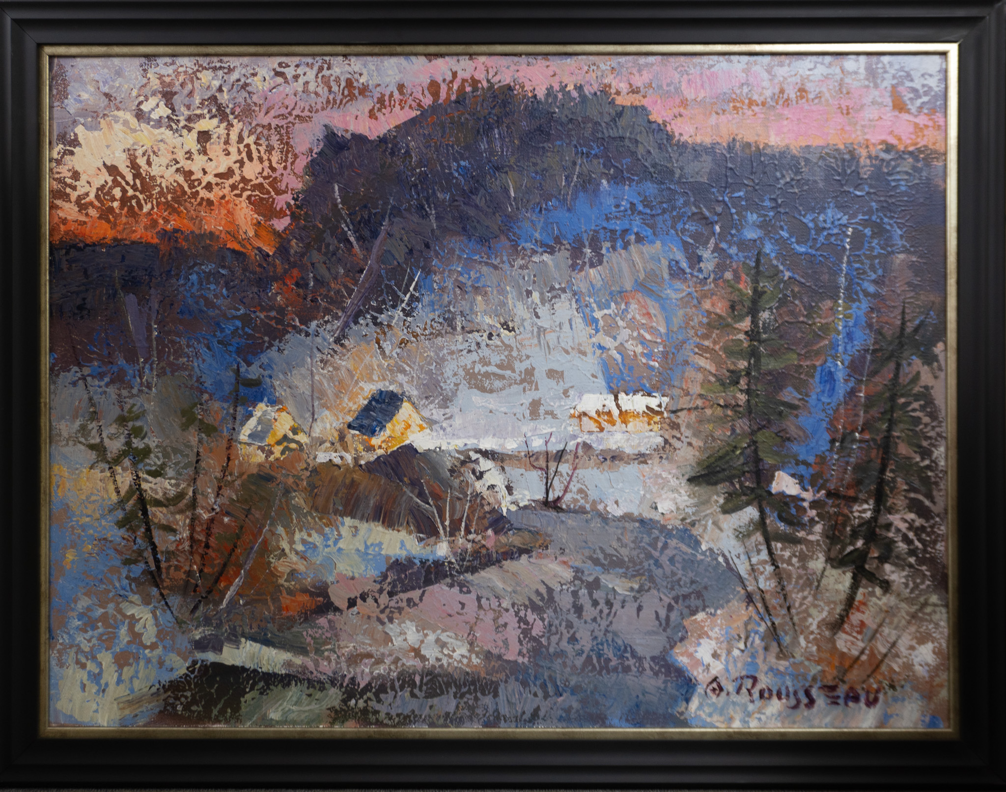 Artiste d’une curiosité insatiable, Albert Rousseau a développé une esthétique de l’expressionnisme texturé. Son style se distingue par une recherche constante sur la matière : il mélangeait souvent l’huile à des matériaux hétérogènes comme la sciure de bois ou le sable pour donner à ses paysages et ses scènes de vieux moulins une épaisseur tactile. Ses œuvres oscillent entre une figuration solide et une abstraction lyrique, portées par une palette de couleurs riches et une lumière qui semble émaner de la substance même de la peinture.