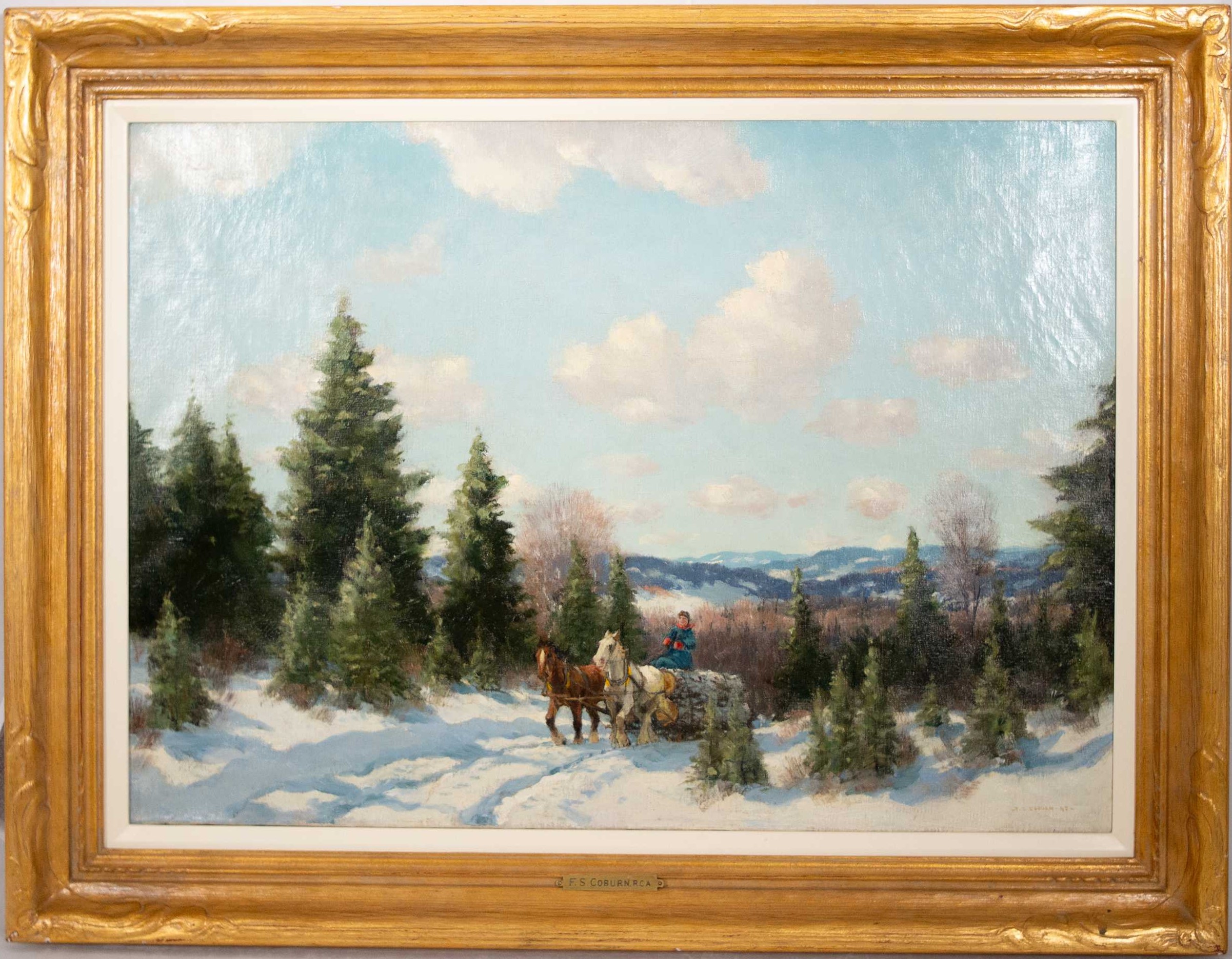 Originaire des Cantons-de-l’Est, Frederick Simpson Coburn a développé une esthétique du réalisme atmosphérique. Après une formation rigoureuse en Europe, son style s’est cristallisé autour de la représentation de la vie rurale québécoise. Il est célèbre pour ses scènes de chevaux tirant des traîneaux dans des paysages enneigés, où il excelle à rendre la texture de la neige, le givre dans l’air et la lumière bleutée des fins de journées hivernales. Sa technique, alliant précision du dessin et fluidité de la touche impressionniste, confère à ses œuvres une atmosphère de calme et de dignité.