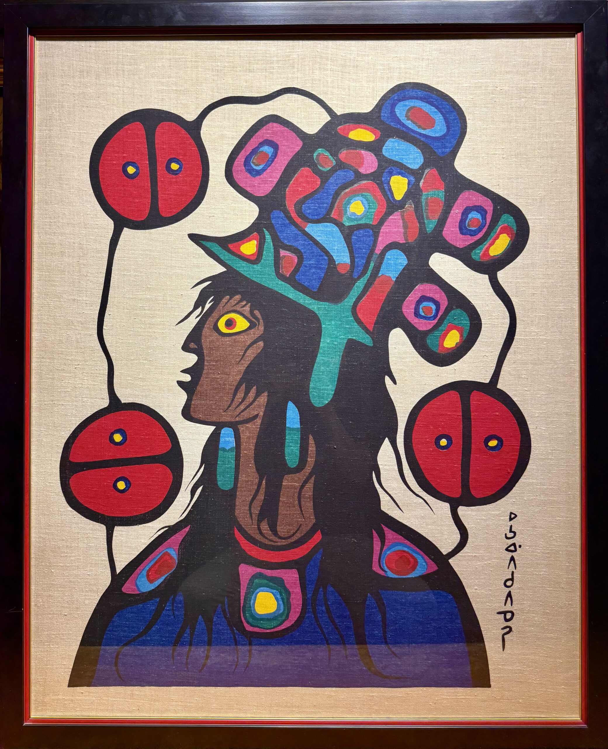 Véritable révolutionnaire visuel, Norval Morrisseau a créé l’esthétique du style Woodland (ou « art des légendes »). Son style se définit par des lignes de contour noires épaisses et puissantes, souvent appelées « lignes de force », qui relient les êtres entre eux. Il utilisait des couleurs primaires vibrantes et des « rayons X » picturaux pour révéler l’intérieur des animaux et des humains, exposant leurs organes, leurs squelettes ou leurs énergies spirituelles. Cette approche transforme la toile en un espace sacré où le monde physique et le monde spirituel fusionnent.