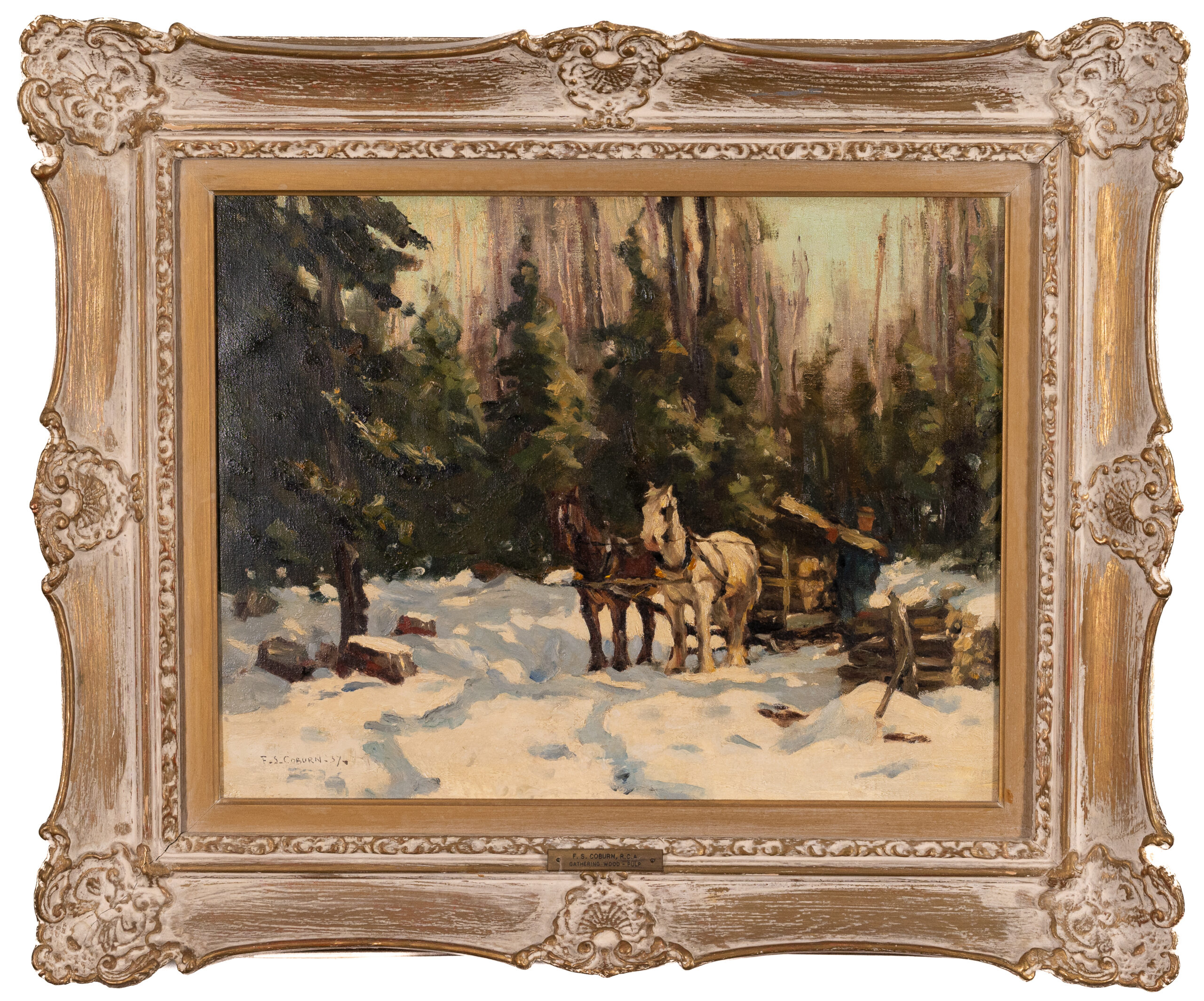 Originaire des Cantons-de-l’Est, Frederick Simpson Coburn a développé une esthétique du réalisme atmosphérique. Après une formation rigoureuse en Europe, son style s’est cristallisé autour de la représentation de la vie rurale québécoise. Il est célèbre pour ses scènes de chevaux tirant des traîneaux dans des paysages enneigés, où il excelle à rendre la texture de la neige, le givre dans l’air et la lumière bleutée des fins de journées hivernales. Sa technique, alliant précision du dessin et fluidité de la touche impressionniste, confère à ses œuvres une atmosphère de calme et de dignité.